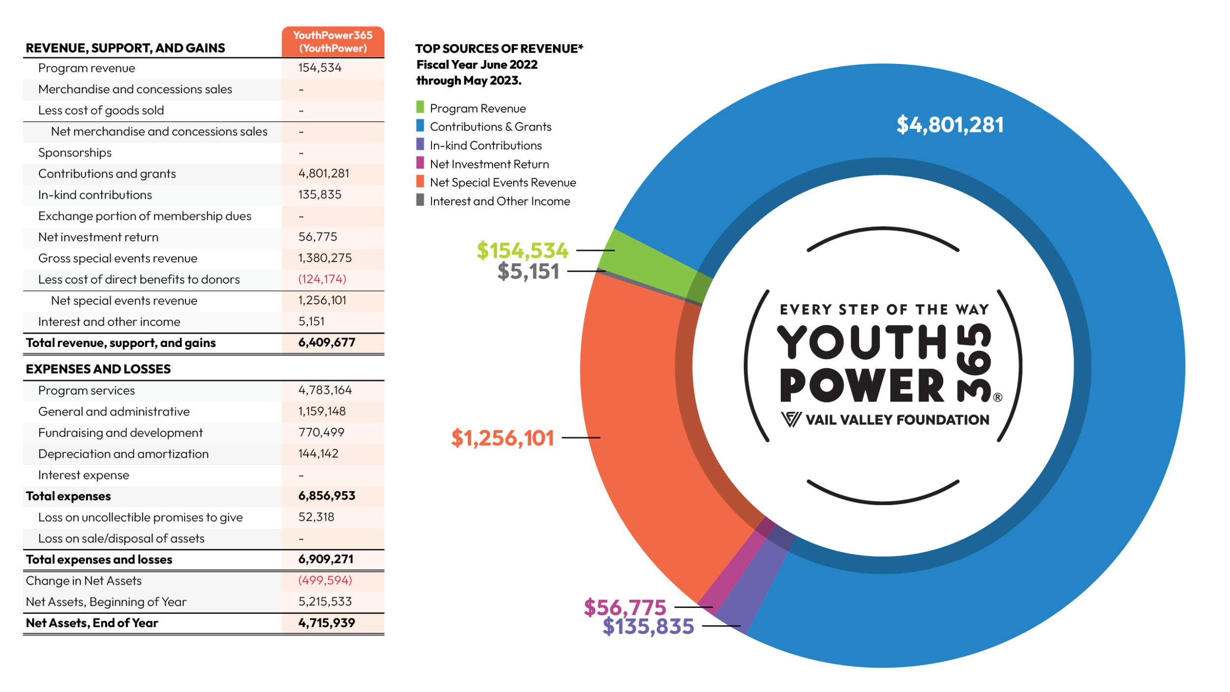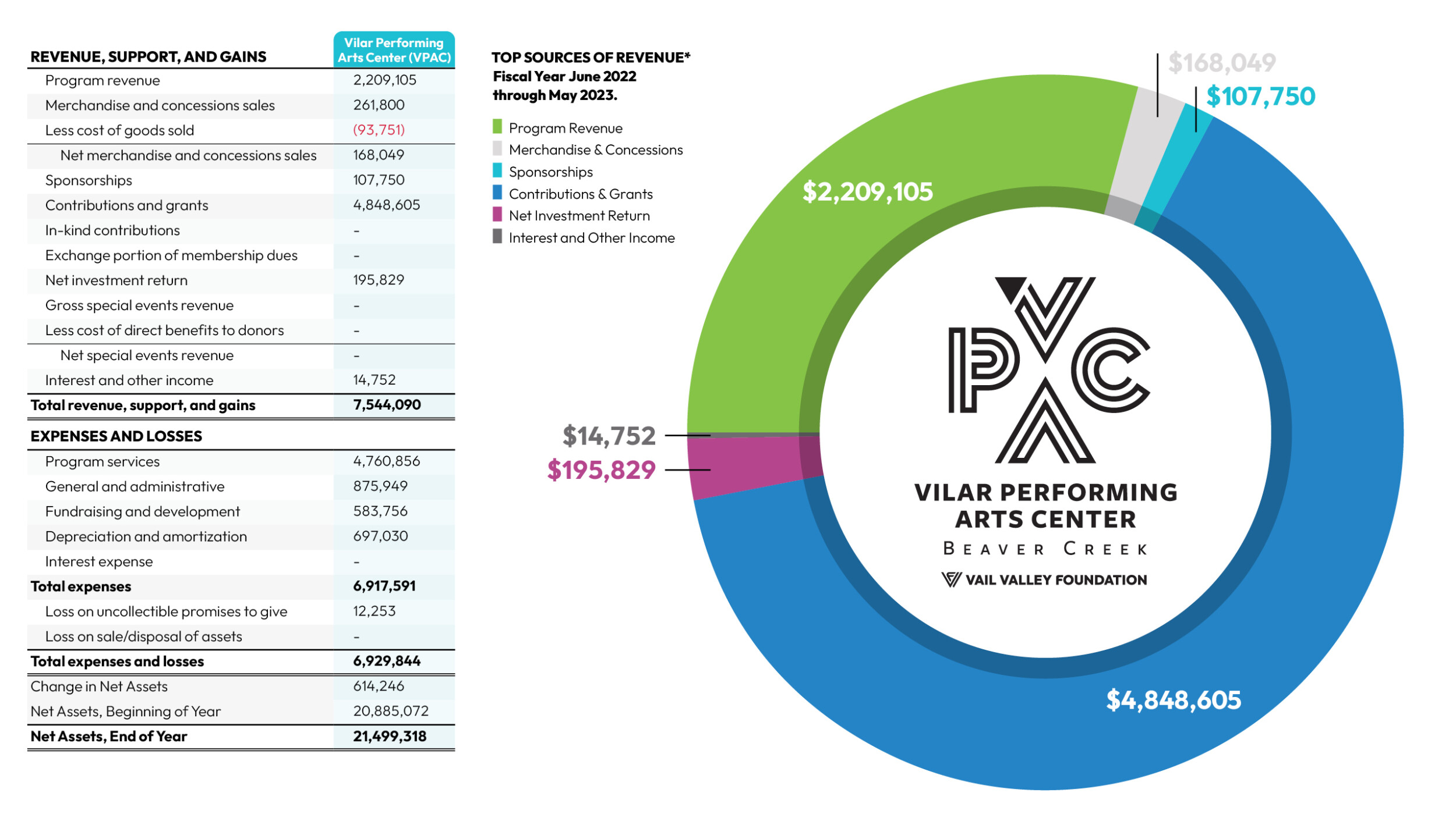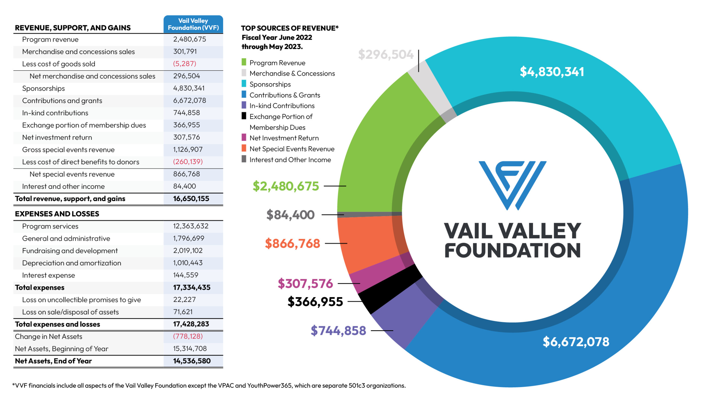 The 2023 Vail Valley Foundation Financials reflect a fiscal year of June 1, 2022 to May 31, 2023.